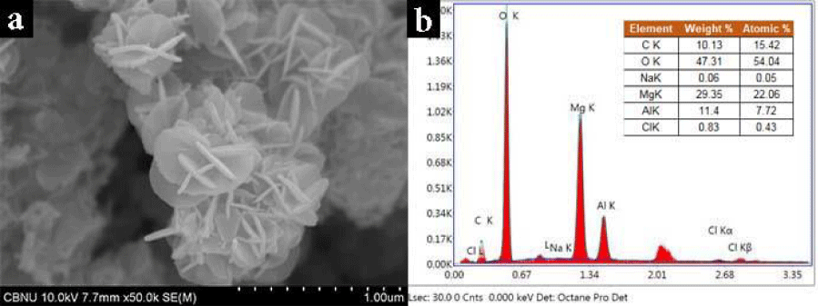 SEM image SEM-EDX analysis: The morphologies of MgAl-LDH000 were characterized by SEM EDX. As shown in Figure 2, a typical hydrotalcite-like structure was exhibited and the orderliness was clearly. The MgAl-LDH000 was observed as homogenously distributed nano particles with layered double structure. A distance between layered double structure was measured around 20-30 nm. The ratio of metals is an important parameter for characterizing MgAl-LDH000 compounds and the molar ratio of Mg to Al was 2.57 which is consistent with the initial ratio of Mg/Al.