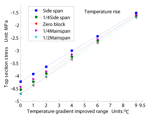 Take the whole bridge as the research object, through the improvement of basic temperature gradient, study on the relationship of the temperature improved range and the box temperature effect. Compressive stress symbol is negative, the tension is positive.