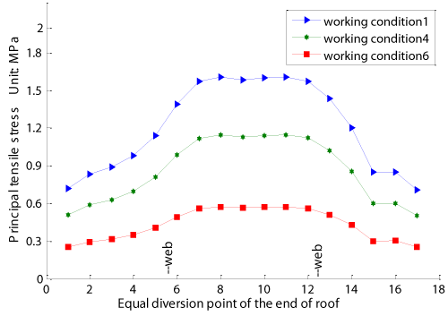The figures 15 and 16 the transverse distribution of temperature principal tensile stress along the box girder roof is uniform distribution. Temperature stress value between two webs is bigger than the two flanges; the stress value of temperature principal tensile stress reduced obviously with the increase of the thickness to top plate; the maximum stress value of top edge and 10 cm away from the top edge and 20 cm away from the top edge are 1.8MPa, 1.1MPa, 0.4MPa. Accordingly, Temperature stress is mainly distributed in box girder roof within 20 cm, as the surface stress, surface reinforced configuration needs to be improved.