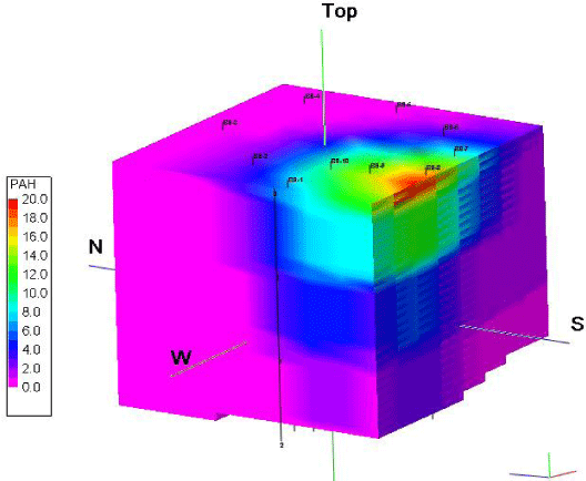 Figure 5: 3-D block model showing the horizontal and vertical variations in PAH concentration around the spill area.