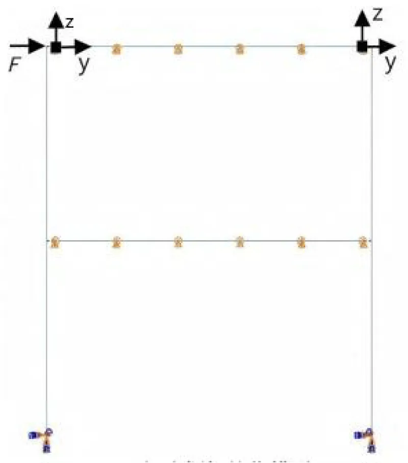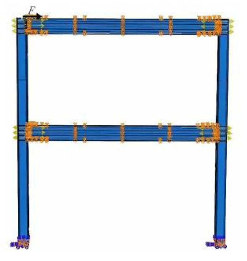 In order to speed up the calculation rate, beam elements are used for the beams and columns of the frame. Considering the Von-Mises yield criterion and the bilinear kinematic hardening constitutive model, the elastic modulus of Q235 steel is 2.06×105 MPa, and the Poisson’s ratio is 0.3.