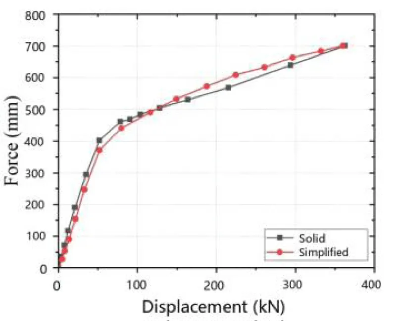 To study the seismic capacity of the flange-widened dog-bone node frame, it is necessary to ensure the accuracy of the simplified model. Establish a solid portal frame model (Figure 4) and a simplified portal frame model (Figure 5). The frame solid model and the frame simplified model are subjected to unidirectional displacement loading [31]. The unidirectional loading was applied to the interlayer displacement angle of 0.1 rad, and the numerical simulation results were compared. It can be concluded that under the same loading conditions, the load-displacement curves calculated by the simplified node model and the solid model are in good agreement. Under the unidirectional displacement loading condition, the ultimate load of the solid model is 324.027 kN, and that of the simplified model is 322.375 kN, with a difference of 0.5%, and a high degree of agreement. This simplified method can effectively simulate the mechanical properties of the node (Figure 6).