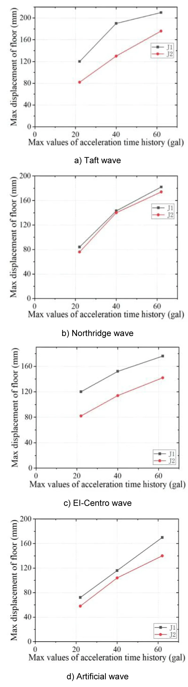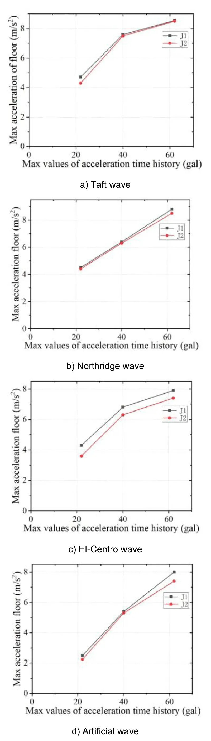 The acceleration response analysis of the J-1 and J-2 frames under earthquake action is shown in Figures 7, 8. The results in the figure show: