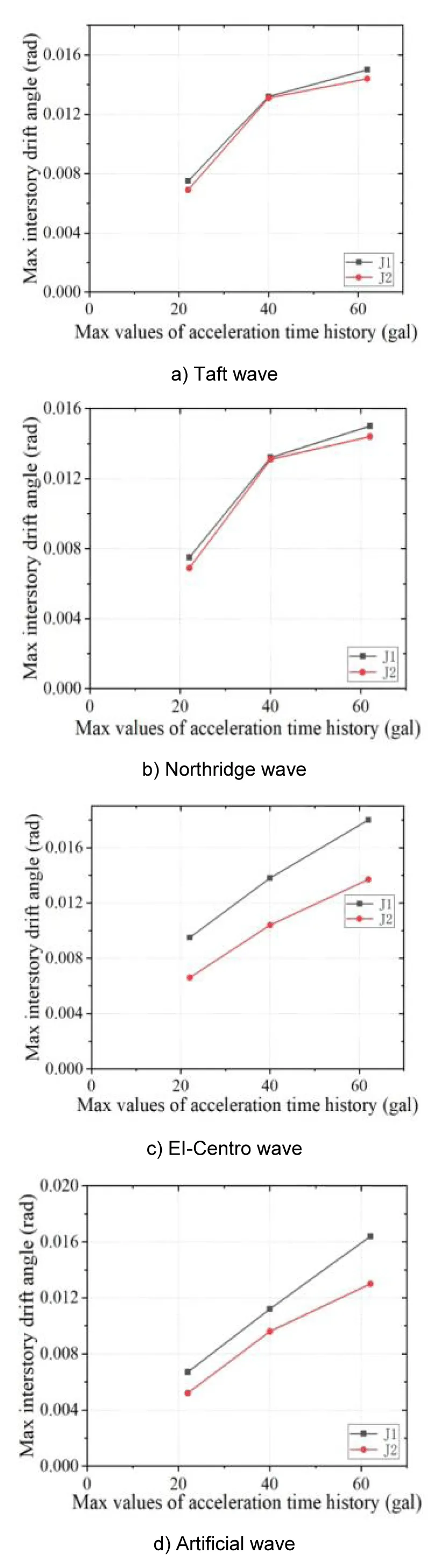 The maximum inter-story displacement angle results of the J-1 and J-2 frames under earthquake action are shown in Figure 9. The results in the figure show: